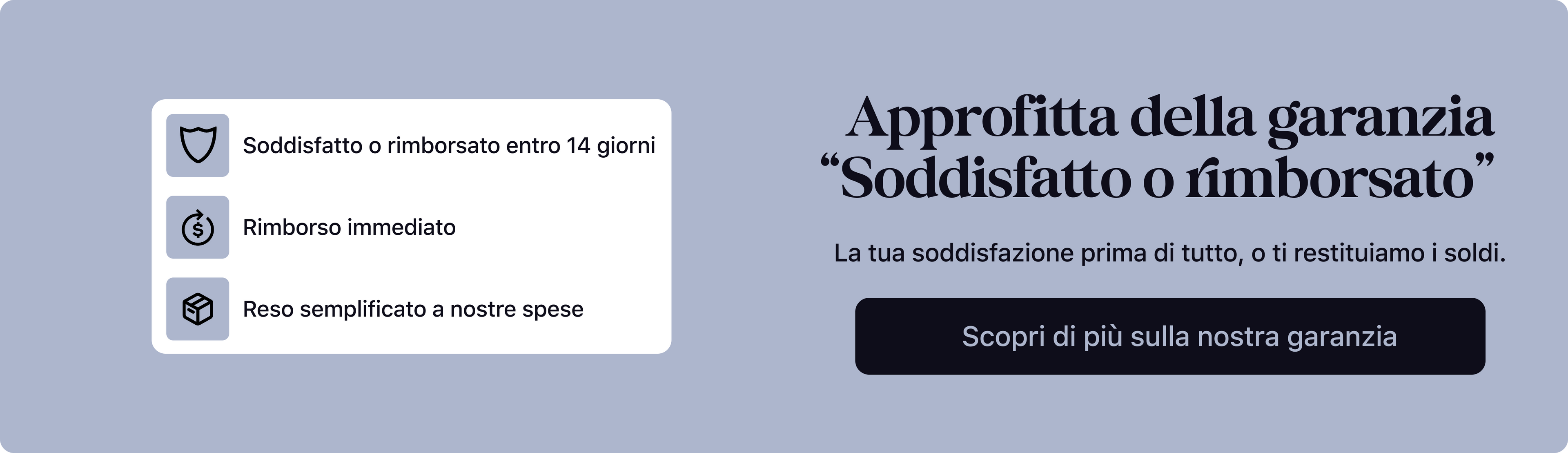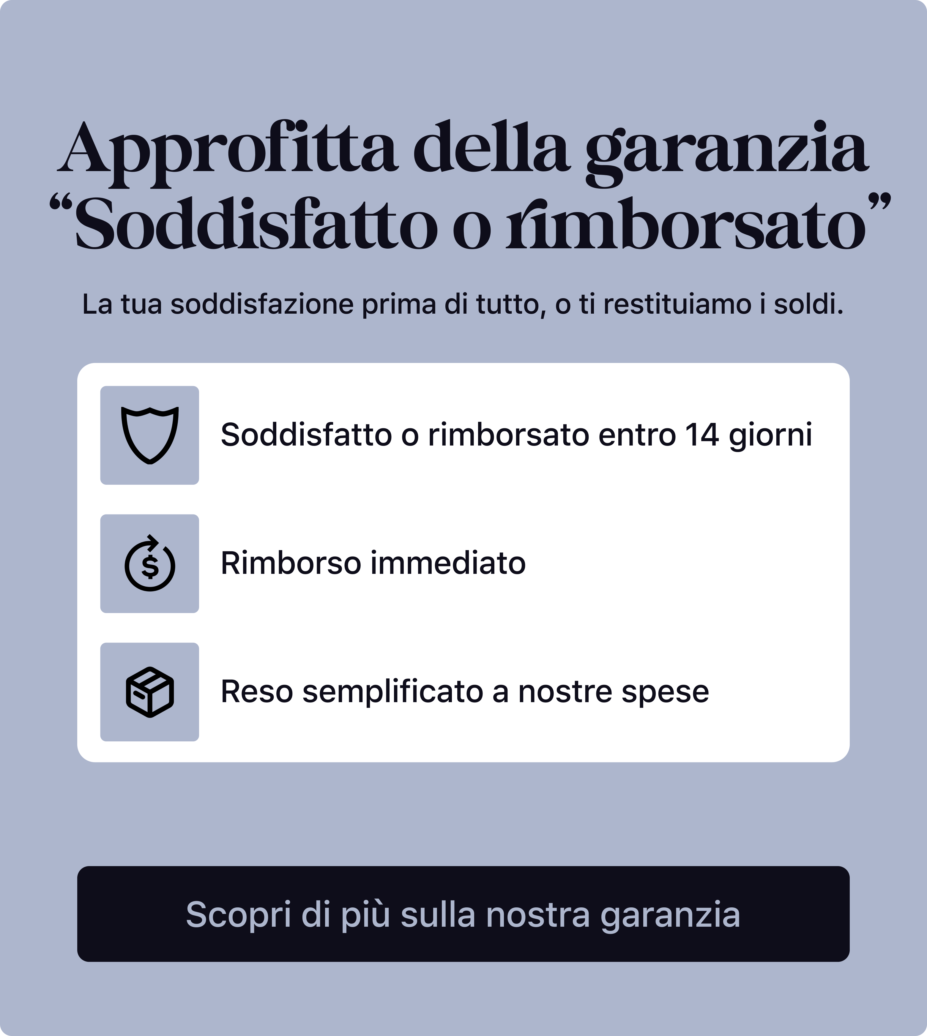 Hai 14 giorni di tempo per cambiare idea. Se il prodotto non ti convince, puoi restituirlo senza dover fornire alcuna spiegazione. Non appena lo riceviamo, verrai rimborsato completamente. Semplice, veloce e senza stress.
